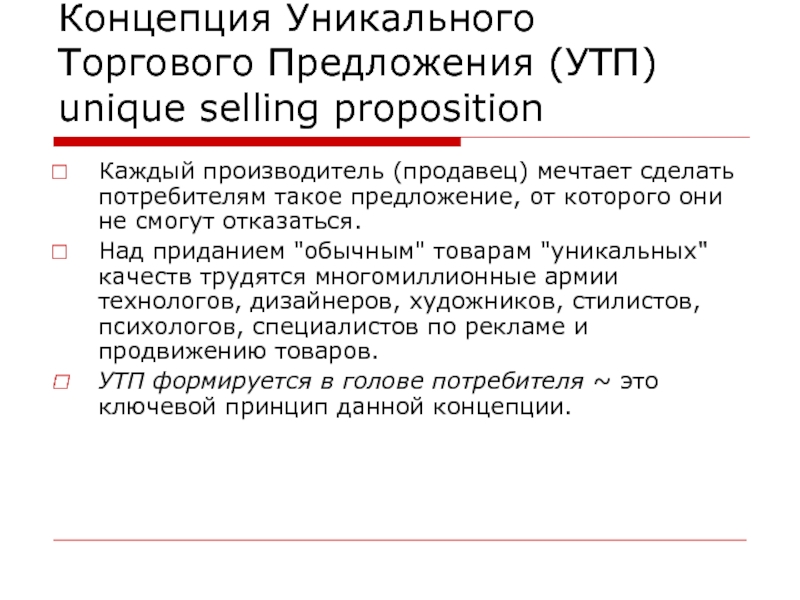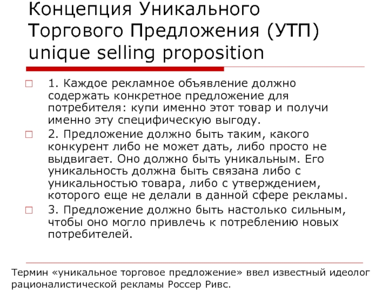 Слайд 28Концепция Уникального Торгового Предложения (УТП) unique selling proposition