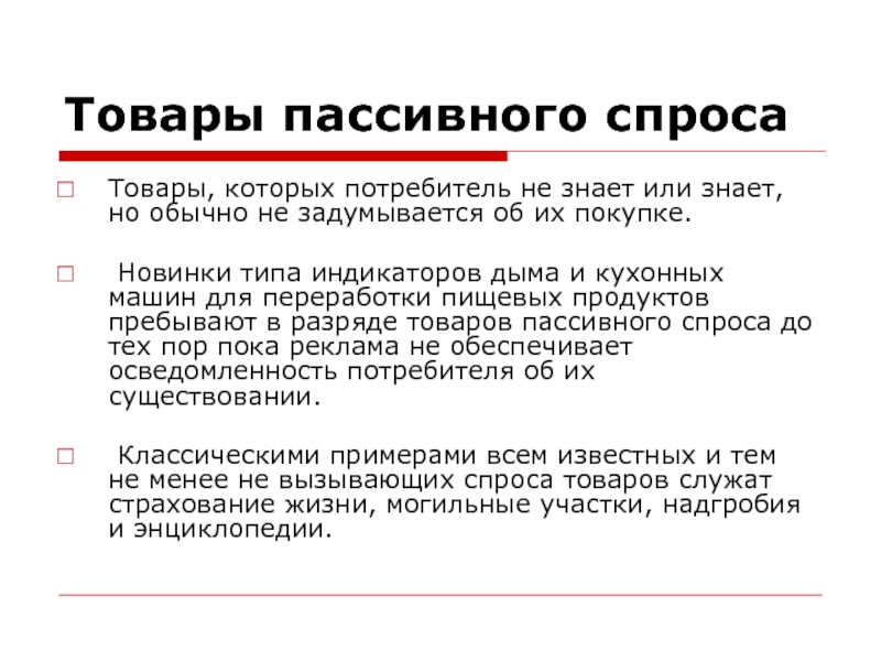Классическими примерами всем известных и тем не менее не вызывающих спроса товаров служат страхование жизни, могильные участки, надгробия и энциклопедии.