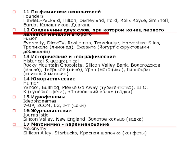 Rocky Mountain Chocolate, Silicon Valley Bank, Вологодское (масло), Тверское (пиво), Урал (мотоцикл), Гиппократ (книжный магазин)