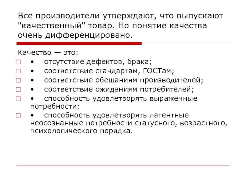 Слайд 27Все производители утверждают, что выпускают "качественный" товар. Но понятие качества очень