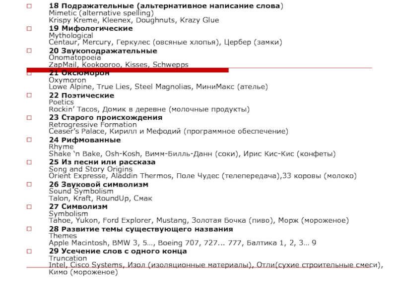 Nutrasweet, Kodak, Victorinox, LaserJet, PowerBook, PageMaker,ImageWriter, Cambozola (названия сыров Camembert и Gorgonzola), Петерстар (телекоммуникации)