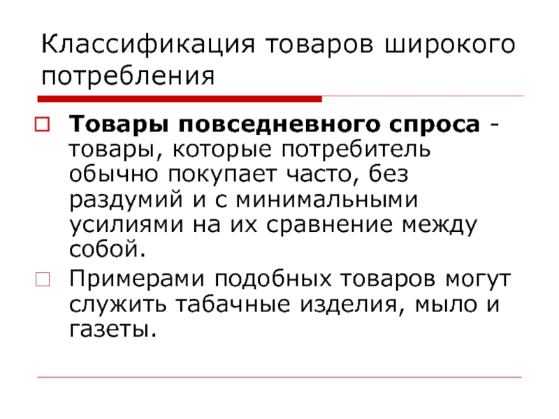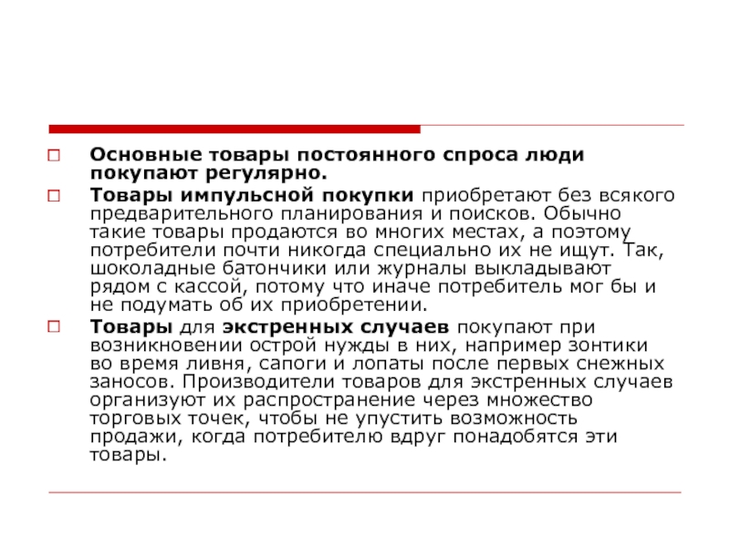 без всякого предварительного планирования и поисков. Обычно такие товары продаются во многих местах, а поэтому потребители почти никогда специально их не ищут. Так, шоколадные батончики или журналы выкладывают рядом с кассой, потому что иначе потребитель мог бы и не подумать об их приобретении.