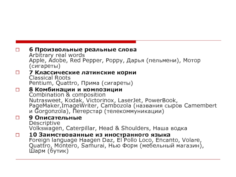 Foreign language Haagen Daz, El Pollo Loco, Encanto, Volare, Quattro, Montero, Samurai, Нью Форм (мебельный магазин), Шарм (бутик)