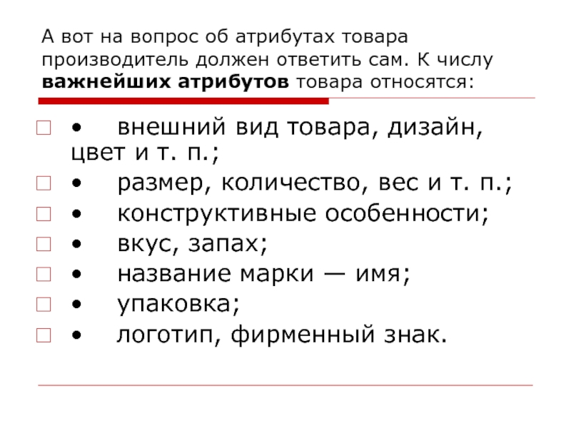 Слайд 26А вот на вопрос об атрибутах товара производитель должен ответить сам.