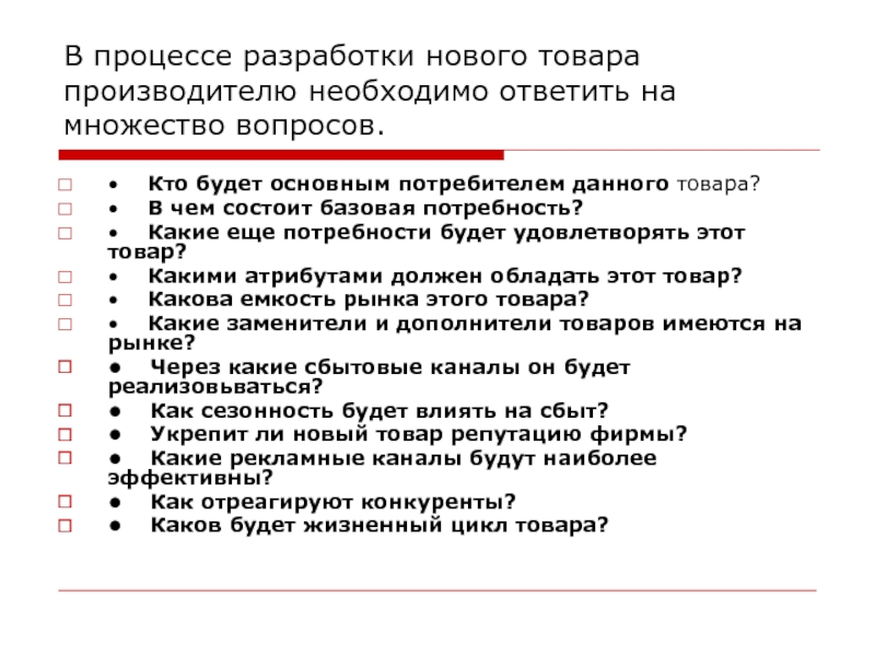 Слайд 25В процессе разработки нового товара производителю необходимо ответить на множество вопросов.