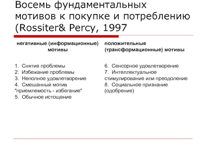 Слайд 6Восемь фундаментальных мотивов к покупке и потреблению (Rossiter& Percy, 1997