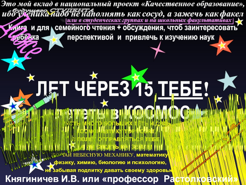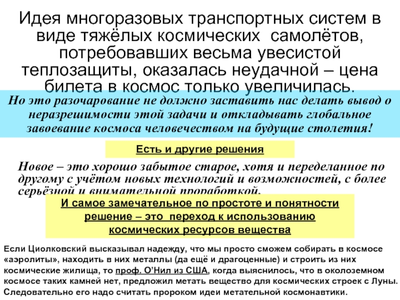 Но это разочарование не должно заставить нас делать вывод о неразрешимости этой задачи и откладывать глобальное завоевание космоса человечеством на будущие столетия!