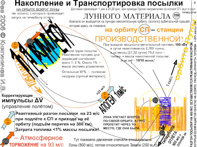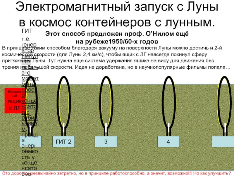 В принципе таким способом благодаря вакууму на поверхности Луны можно достичь и 2-й космической скорости (для Луны 2,4 км/с), чтобы ящик с ЛГ навсегда покинул сферу притяжения Луны. Тут нужна еще система удержания ящика на вису для движения без трения на большой скорости. Идея не доработана, но в научнопопулярные фильмы попала…
