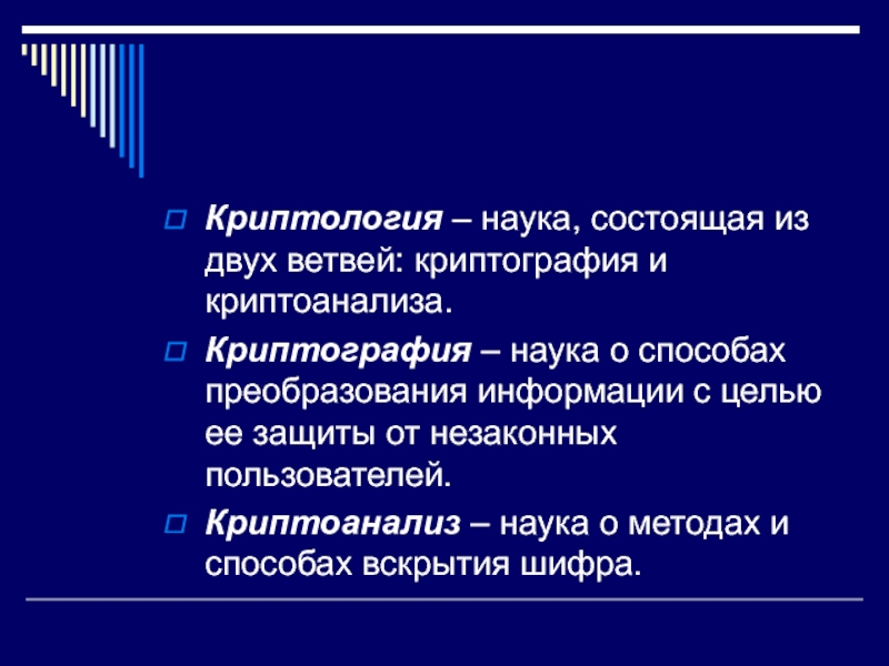 Криптология – наука, состоящая из двух ветвей: криптография и криптоанализа.