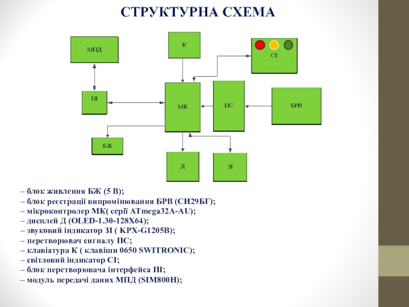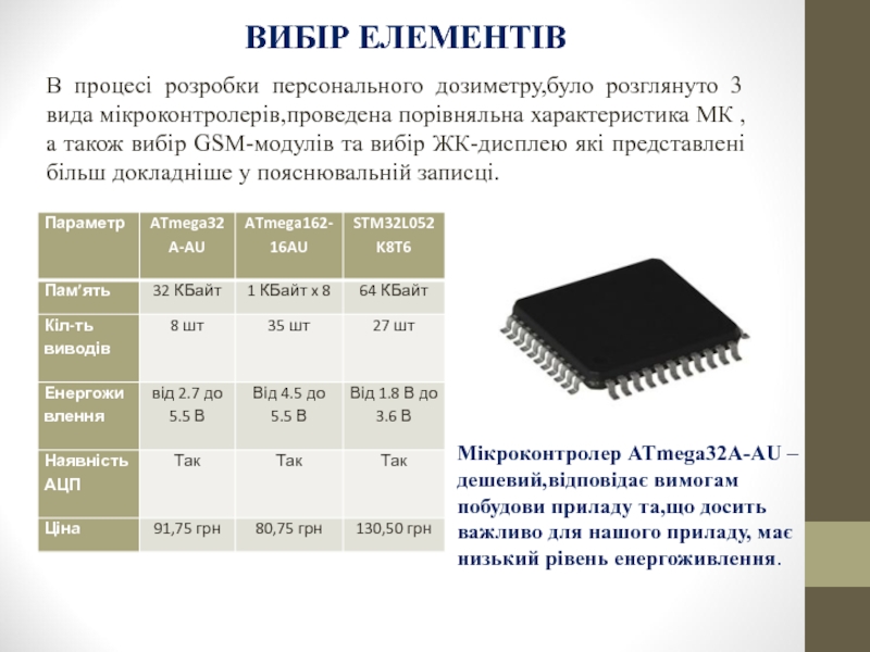 Мікроконтролер ATmega32A-AU –дешевий,відповідає вимогам побудови приладу та,що досить важливо для нашого приладу, має низький рівень енергоживлення.