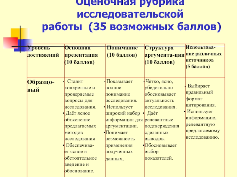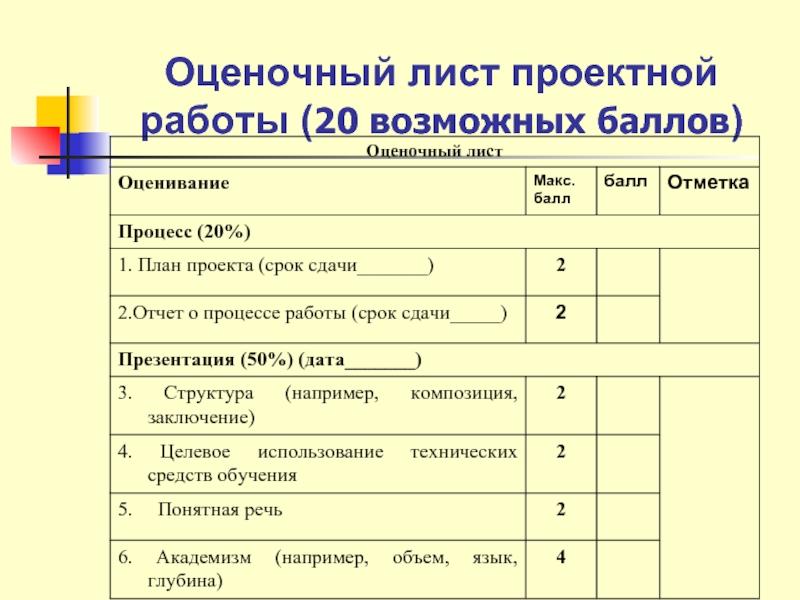 Слайд 23Оценочный лист проектной работы (20 возможных баллов)