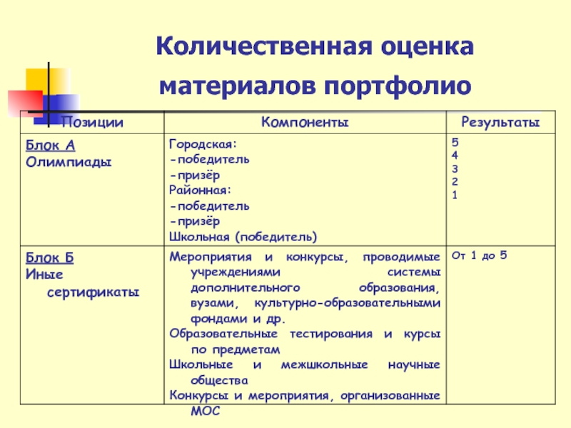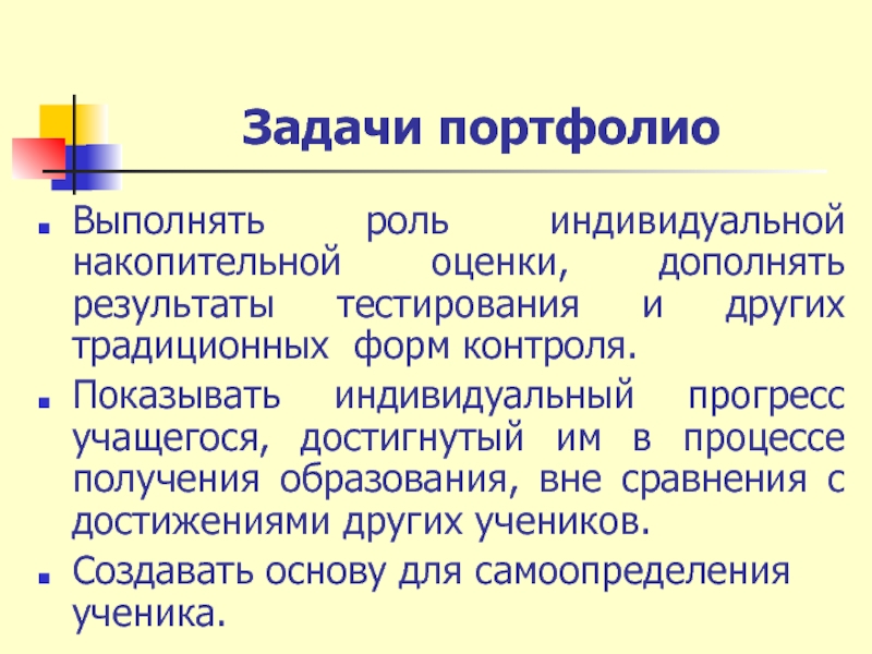 Выполнять роль индивидуальной накопительной оценки, дополнять результаты тестирования и других