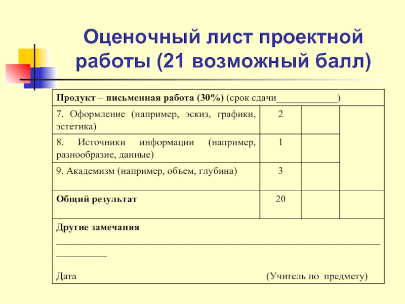 Слайд 24Оценочный лист проектной работы (21 возможный балл)