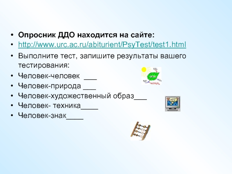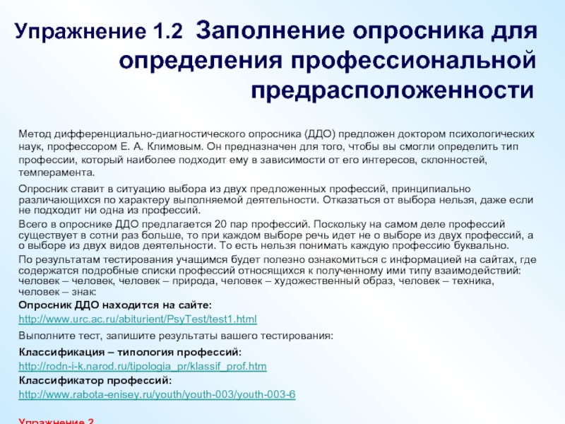 Метод дифференциально-диагностического опросника (ДДО) предложен доктором психологических наук, профессором Е. А. Климовым. Он предназначен для того, чтобы вы смогли определить тип профессии, который наиболее подходит ему в зависимости от его интересов, склонностей, темперамента.