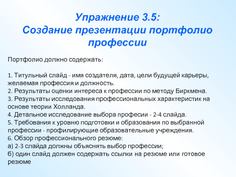 - имя создателя, дата, цели будущей карьеры, желаемая профессия и должность.