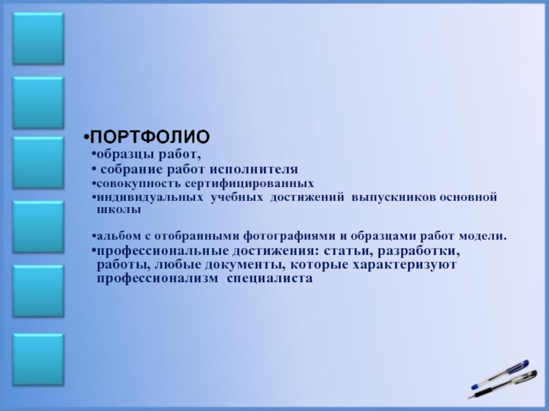 Слайд 3Портфолио — это спланированная заранее, индивидуальная подборка профессиональных достижений.