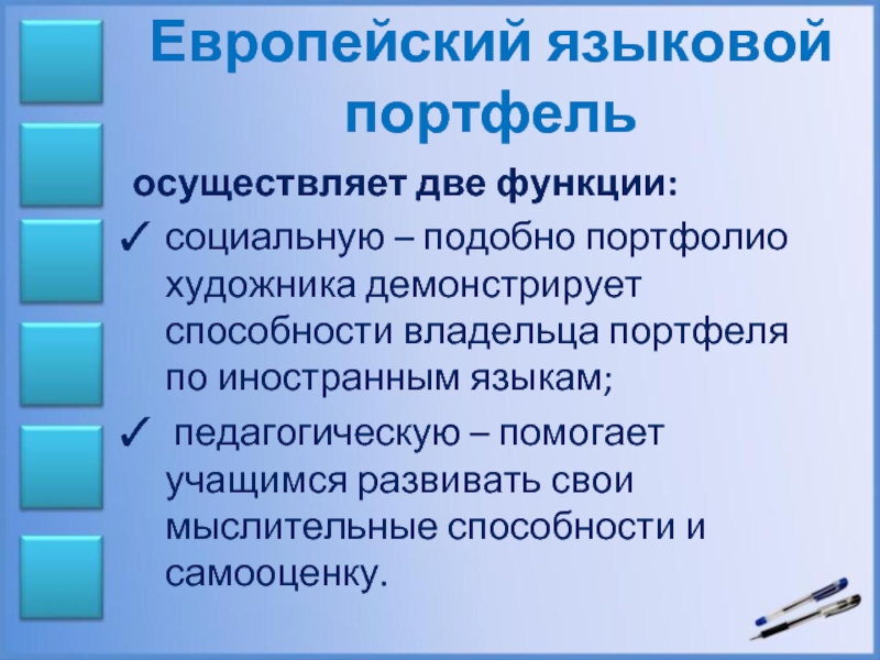 Таким образом, портфолио позволяет владельцу вести запись изучения им языка и самостоятельно оценивать свой уровень с помощью таблиц, ставить индивидуальные цели.