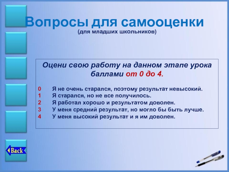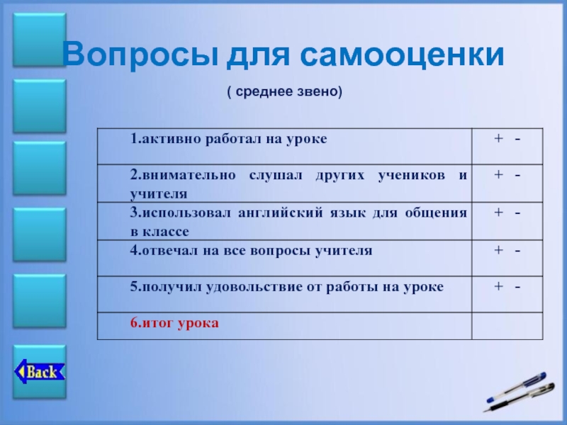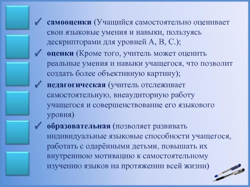 Слайд 15самооценки (Учащийся самостоятельно оценивает свои языковые умения и навыки, пользуясь дескрипторами