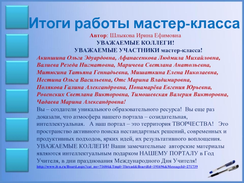 УВАЖАЕМЫЕ КОЛЛЕГИ! Ваши замечательные авторские материалы являются интеллектуальным подарком НАШЕМУ ПОРТАЛУ в Год Учителя, в дни празднования Международного Дня Учителя! http://www.it-n.ru/Board.aspx?cat_no=71684&Tmpl=Thread&BoardId=191696&MessageId=271739