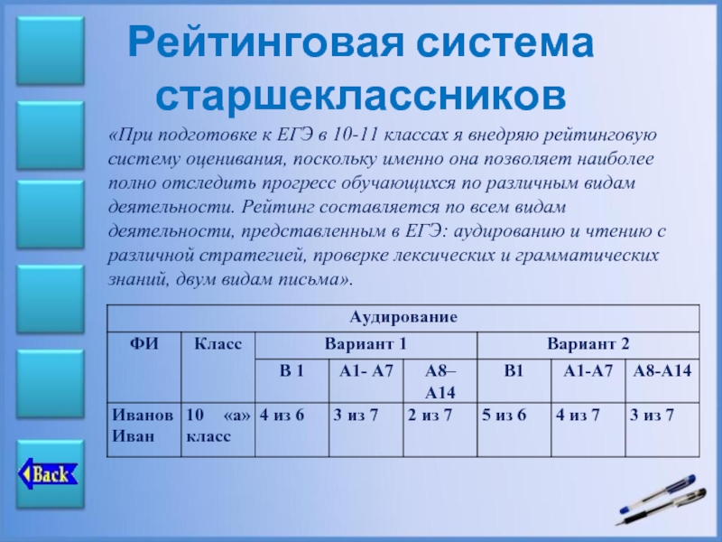 рейтинговую систему оценивания, поскольку именно она позволяет наиболее полно отследить прогресс обучающихся по различным видам деятельности. Рейтинг составляется по всем видам деятельности, представленным в ЕГЭ: аудированию и чтению с различной стратегией, проверке лексических и грамматических знаний, двум видам письма».