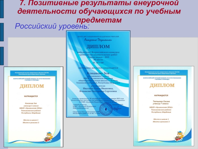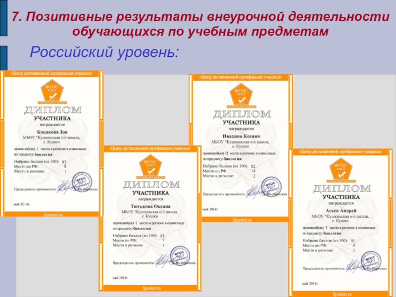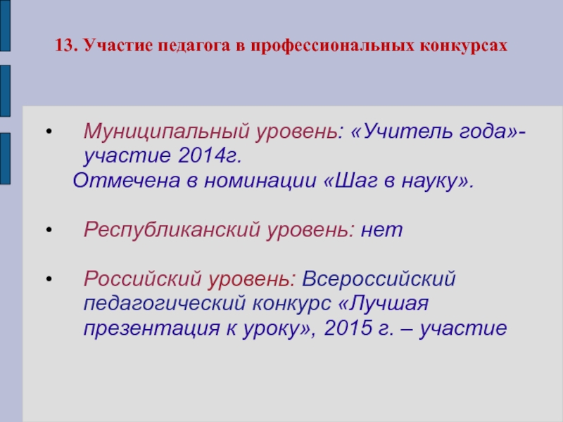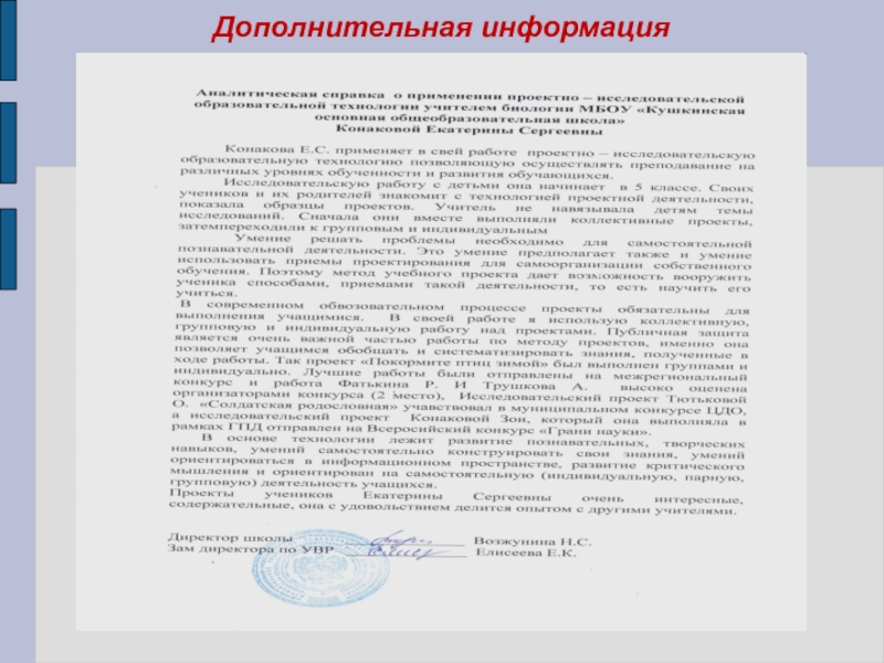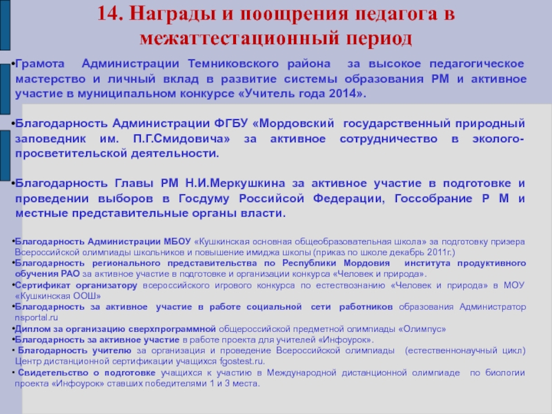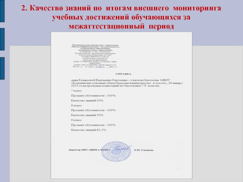 Наличие квалификационной категории: вторая - приказ № 83 от 30.04.09 г. аттестация на соответствие - приказ № 30 от 30.04.2014г.