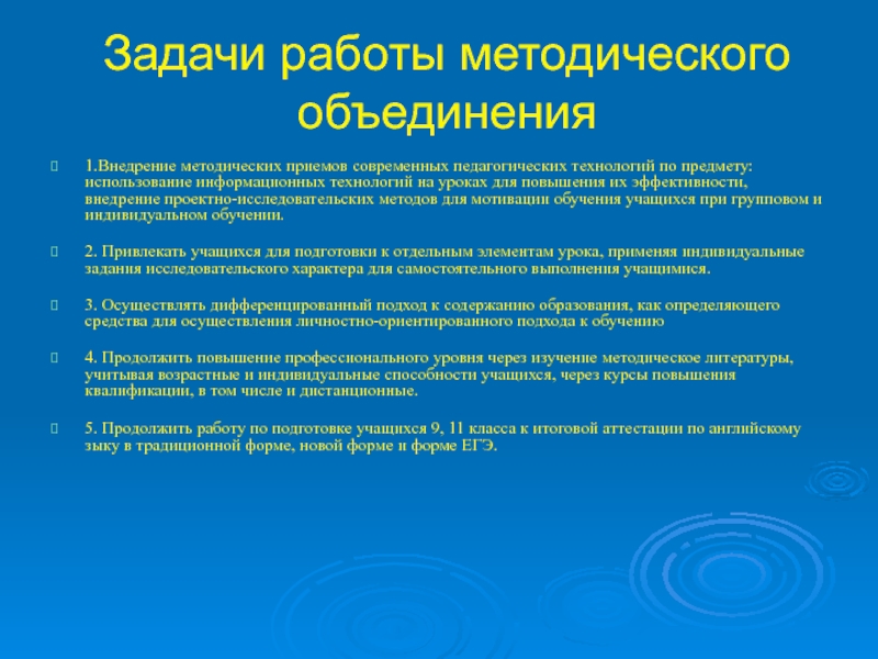5. Продолжить работу по подготовке учащихся 9, 11 класса к итоговой аттестации по английскому зыку в традиционной форме, новой форме и форме ЕГЭ.