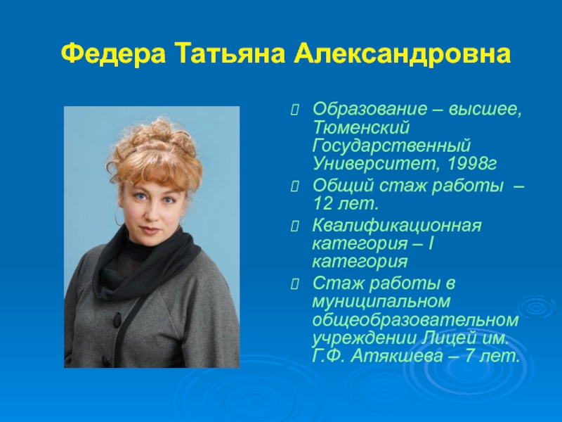 Стаж работы в муниципальном общеобразовательном учреждении Лицей им. Г.Ф. Атякшева – 7 лет.