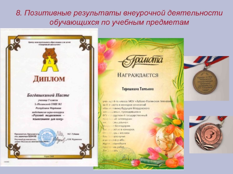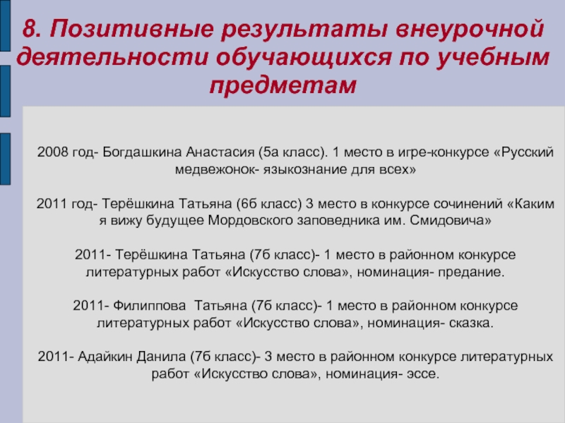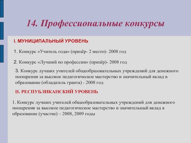 1. Конкурс лучших учителей общеобразовательных учреждений для денежного поощрения за высокое педагогическое мастерство и значительный вклад в образование (участие) – 2008, 2009 годы