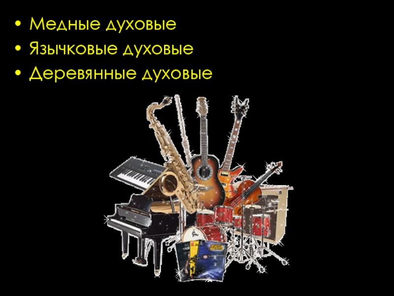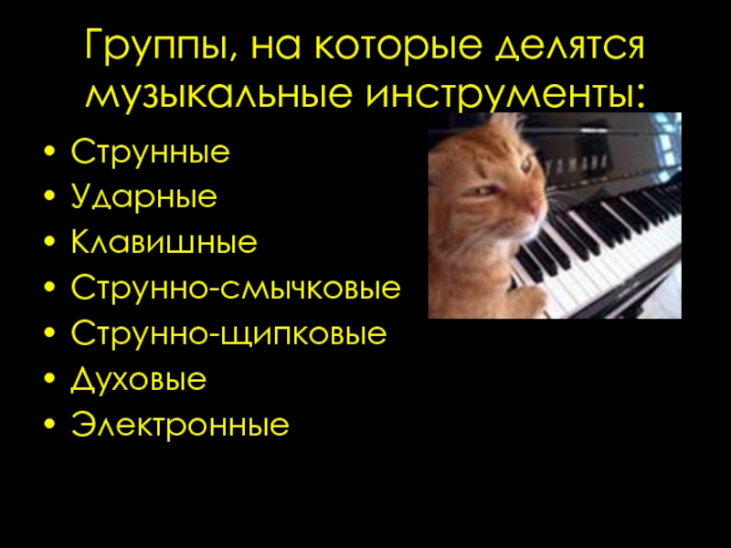 Слайд 7Группы, на которые делятся музыкальные инструменты: