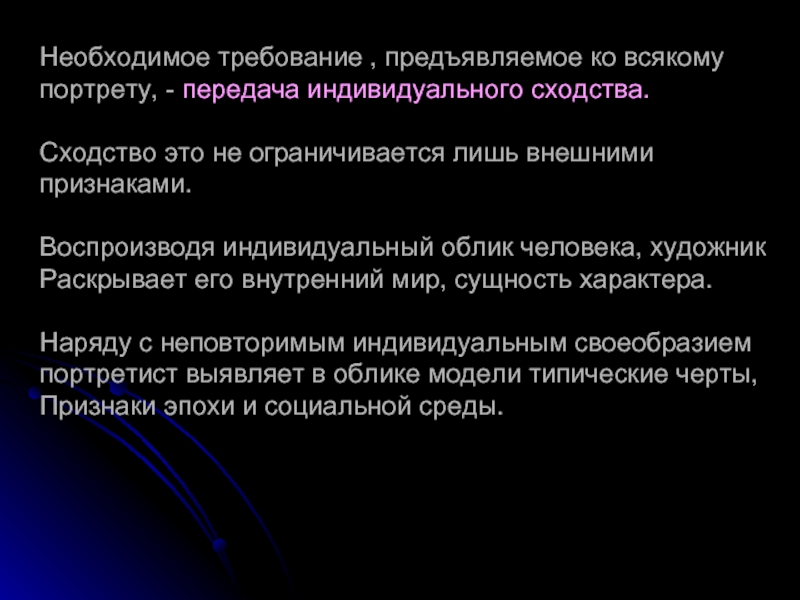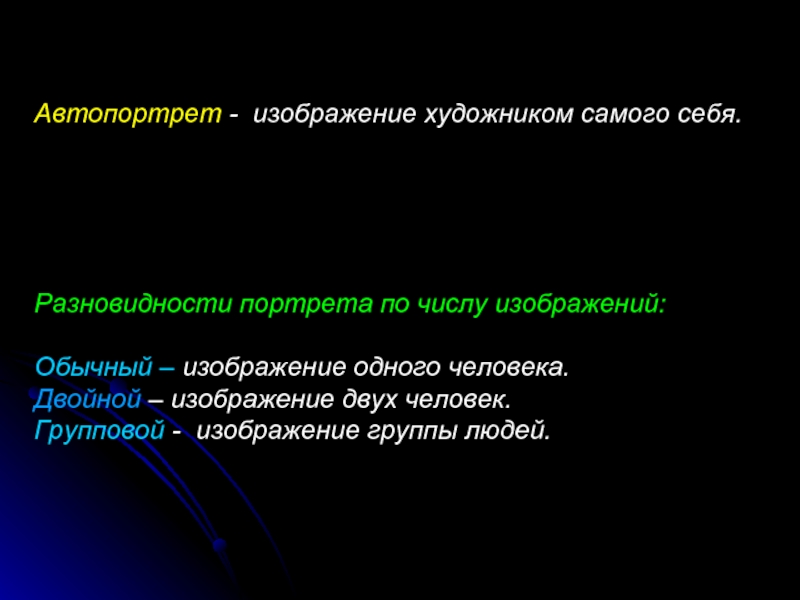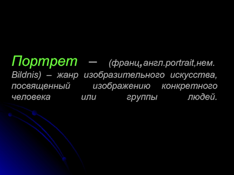 Слайд 2Портрет – (франц,англ.portrait,нем. Bildnis) – жанр изобразительного искусства, посвященный изображению конкретного