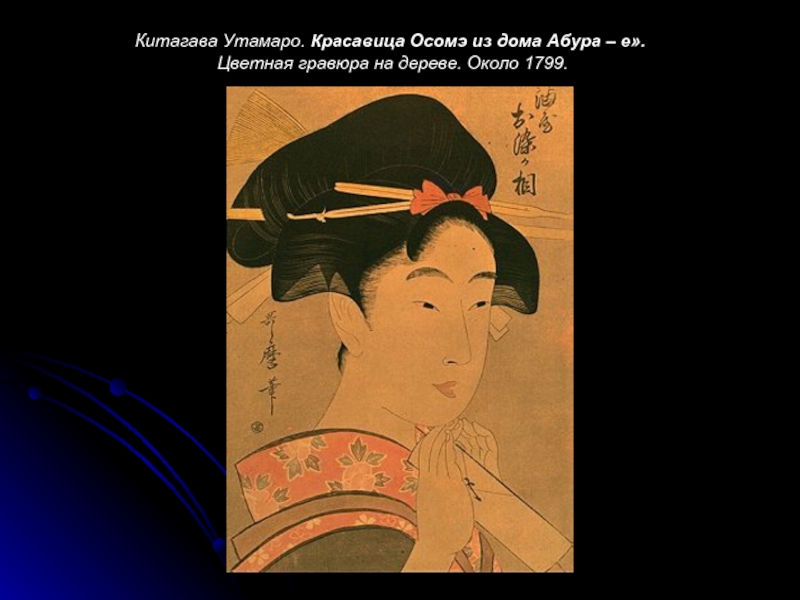 Слайд 12Китагава Утамаро. Красавица Осомэ из дома Абура – е».