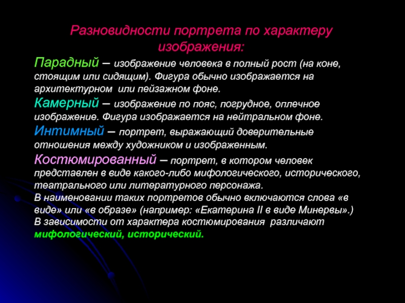 Костюмированный – портрет, в котором человек представлен в виде какого-либо мифологического, исторического, театрального или литературного персонажа.