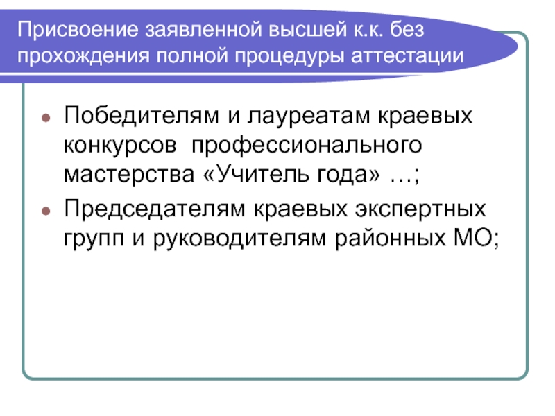 Слайд 20Присвоение заявленной высшей к.к. без прохождения полной процедуры аттестации