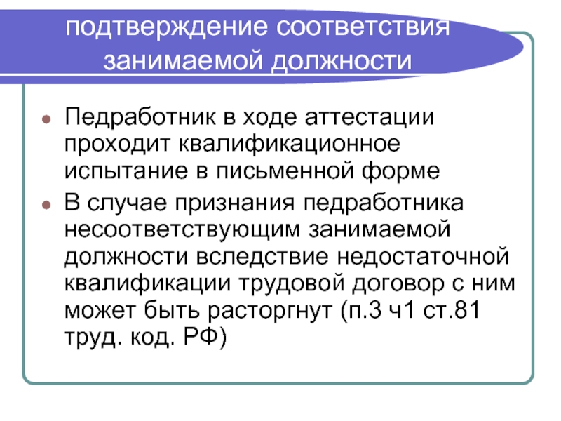 В случае признания педработника несоответствующим занимаемой должности вследствие недостаточной квалификации трудовой договор с ним может быть расторгнут (п.3 ч1 ст.81 труд. код. РФ)