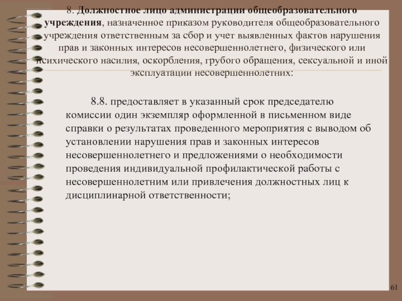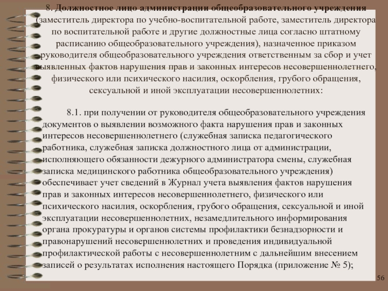 8. Должностное лицо администрации общеобразовательного учреждения, назначенное приказом руководителя общеобразовательного учреждения ответственным за сбор и учет выявленных фактов нарушения прав и законных интересов несовершеннолетнего, физического или психического насилия, оскорбления, грубого обращения, сексуальной и иной эксплуатации несовершеннолетних: