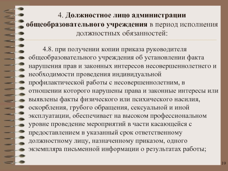 Слайд 19 4.8. при получении копии приказа руководителя общеобразовательного учреждения об установлении факта
