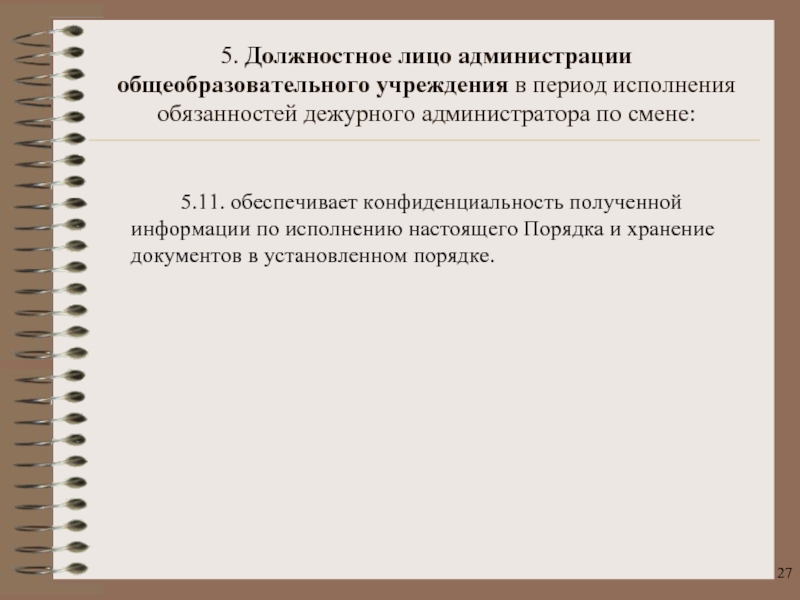 5. Должностное лицо администрации общеобразовательного учреждения в период исполнения обязанностей дежурного администратора по смене: