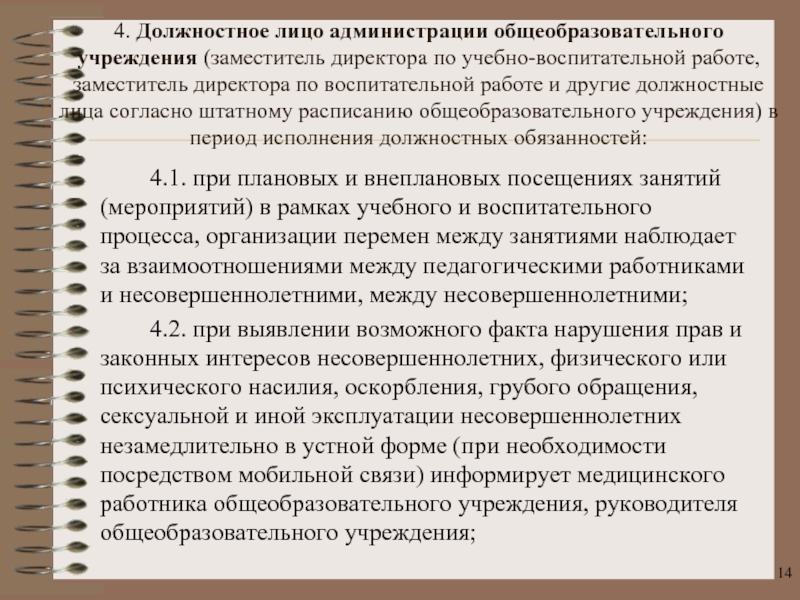 4.1. при плановых и внеплановых посещениях занятий (мероприятий) в рамках учебного и воспитательного процесса, организации перемен между занятиями наблюдает за взаимоотношениями между педагогическими работниками и несовершеннолетними, между несовершеннолетними;