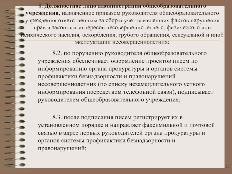 Слайд 57 8.2. по поручению руководителя общеобразовательного учреждения обеспечивает оформление проектов писем по