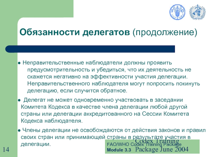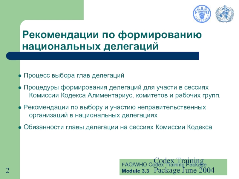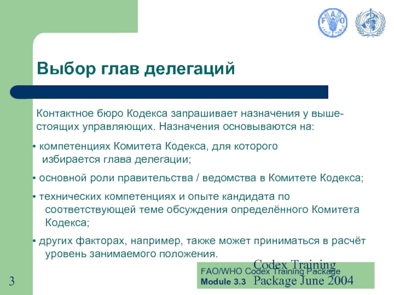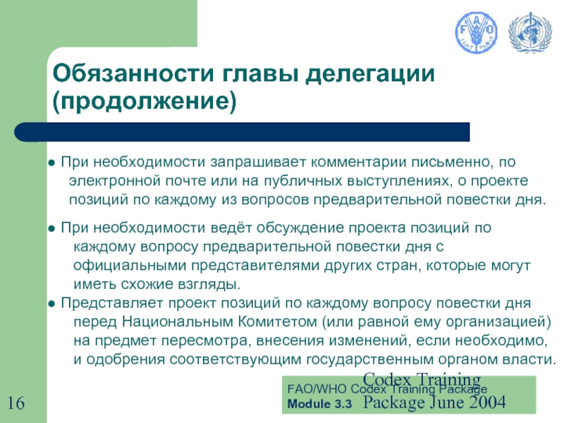 Обязанности главы делегации на сессиях Комиссии Кодекса