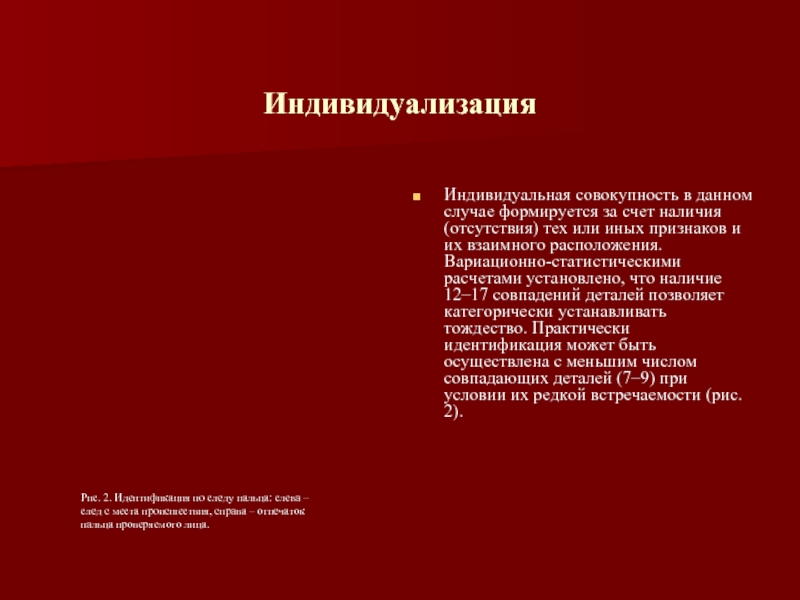 как совпадение по общим (тип узора, направление потоков линий), так и частным признакам (деталям) узора. К ним относятся: начало и окончание линий, их слияние и расхождение; обрывки линий; "крючки", "мостики", "глазки", точки, изгибы, перерывы линий, тонкие линии (рис. 1).