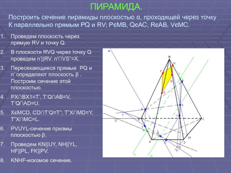 Построить сечение пирамиды плоскостью α, проходящей через точку К параллельно прямым