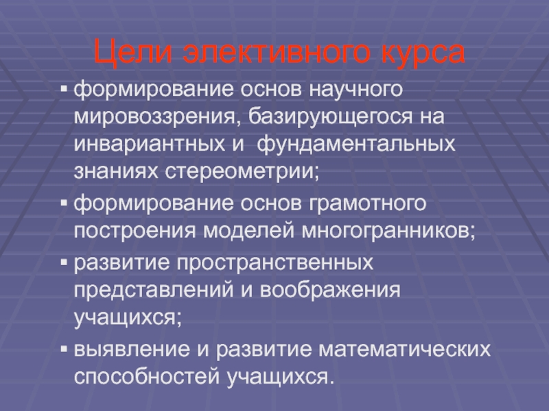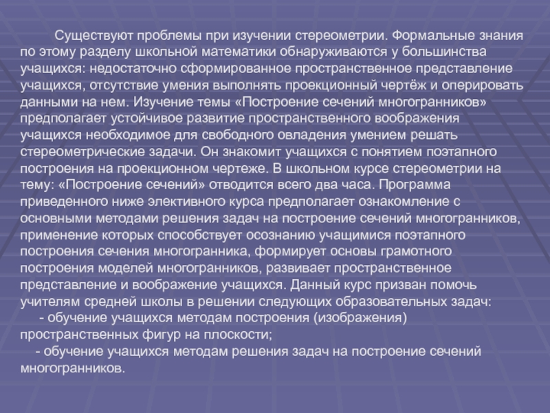 знания по этому разделу школьной математики обнаруживаются у большинства учащихся: недостаточно сформированное пространственное представление учащихся, отсутствие умения выполнять проекционный чертёж и оперировать данными на нем. Изучение темы «Построение сечений многогранников» предполагает устойчивое развитие пространственного воображения учащихся необходимое для свободного овладения умением решать стереометрические задачи. Он знакомит учащихся с понятием поэтапного построения на проекционном чертеже. В школьном курсе стереометрии на тему: «Построение сечений» отводится всего два часа. Программа приведенного ниже элективного курса предполагает ознакомление с основными методами решения задач на построение сечений многогранников, применение которых способствует осознанию учащимися поэтапного построения сечения многогранника, формирует основы грамотного построения моделей многогранников, развивает пространственное представление и воображение учащихся. Данный курс призван помочь учителям средней школы в решении следующих образовательных задач: