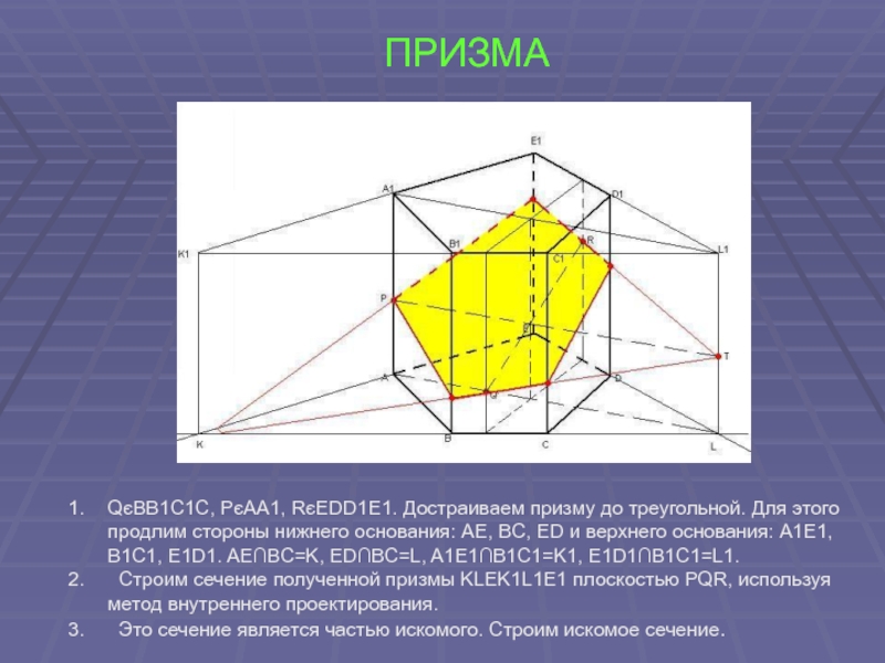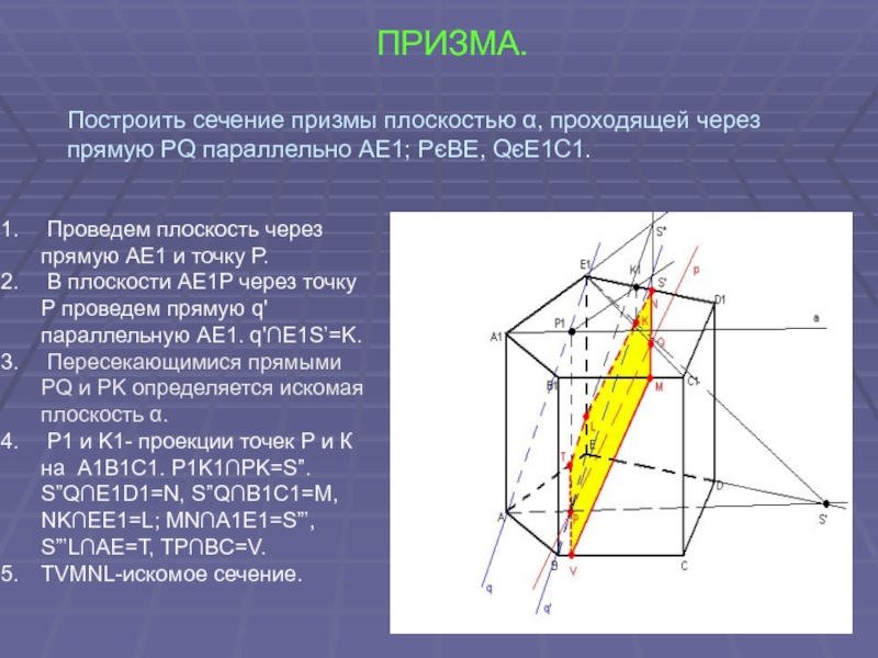 P1 и K1- проекции точек Р и К на А1В1С1. P1K1∩PK=S”. S”Q∩E1D1=N, S”Q∩B1C1=M, NK∩EE1=L; MN∩A1E1=S”’, S”’L∩AE=T, TP∩BC=V.