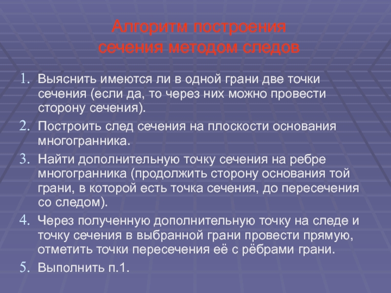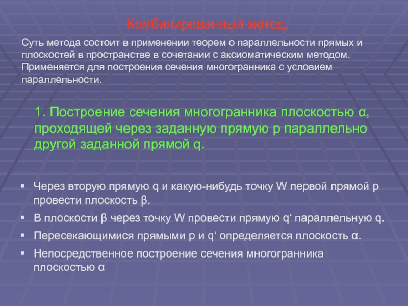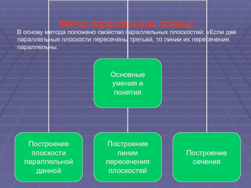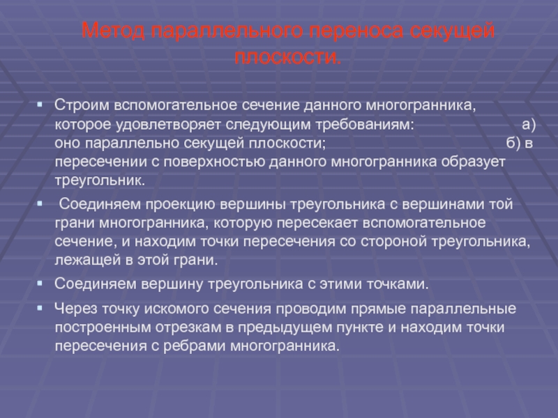 Суть метода состоит в применении теорем о параллельности прямых и плоскостей в пространстве в сочетании с аксиоматическим методом. Применяется для построения сечения многогранника с условием параллельности.
