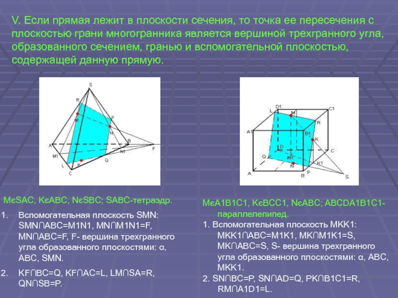 Слайд 11V. Если прямая лежит в плоскости сечения, то точка ее пересечения