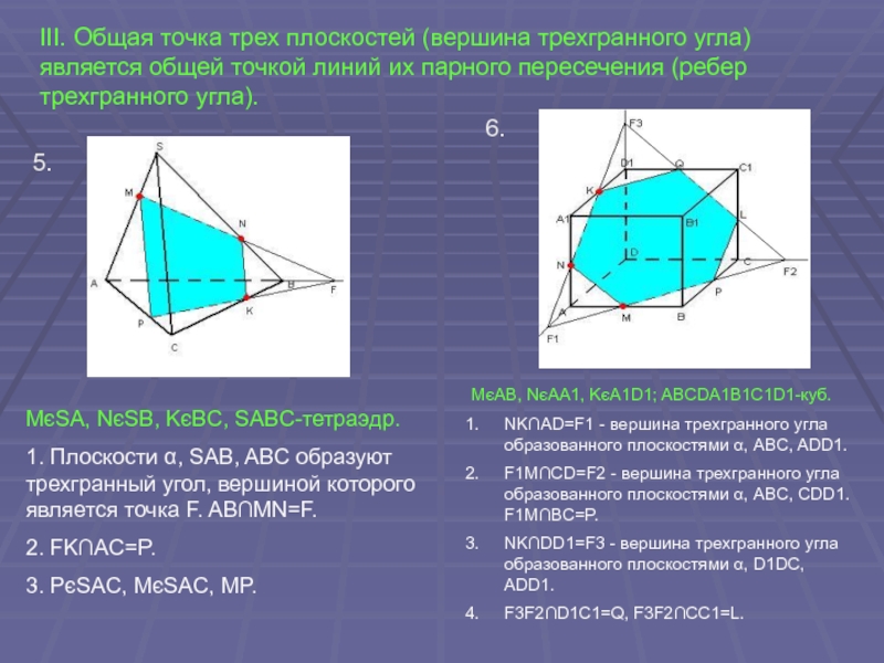Слайд 9III. Общая точка трех плоскостей (вершина трехгранного угла) является общей точкой