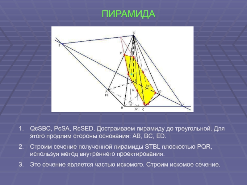 Построить сечение пирамиды плоскостью α, проходящей через прямую PQ параллельно AR; PєBC, QєMA, RєMAC.