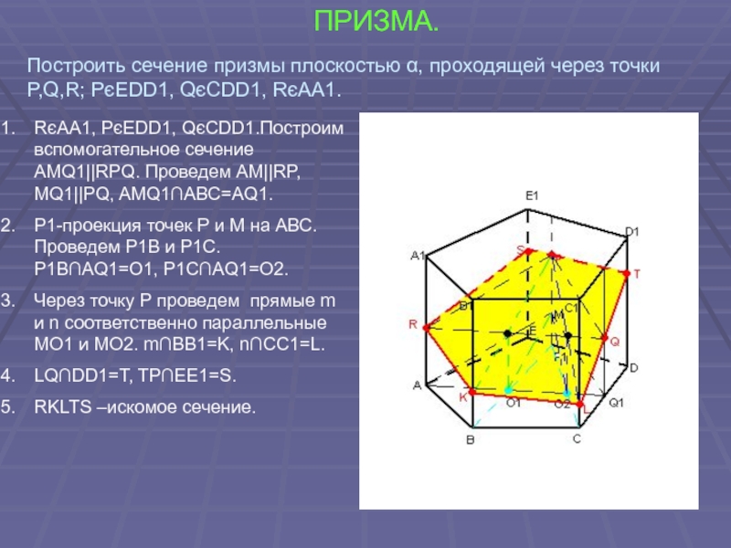 Построить сечение призмы плоскостью α, проходящей через точки P,Q,R; PєEDD1, QєCDD1, RєAA1.