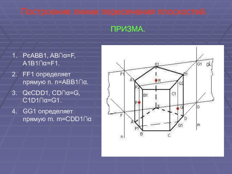 Находим линии пересечения (например m и n) плоскости α с гранями многогранника содержащими точки P и Q.